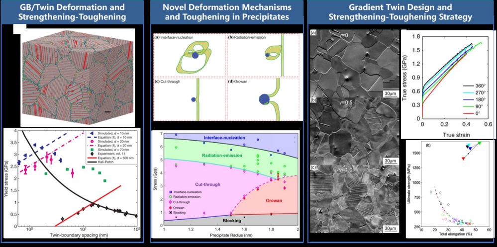 The macroscopic mechanical performance of metallic materials is fundamentally governed by the evolution and interaction of multi-scale microscopic defects, such as dislocations, interfaces, and precipitates. Revealing the internal correlation between microscopic interface behavior and macroscopic strength-toughness response is a central task in the study of solid constitutive relations. Addressing these long-standing key challenges in the fields of mechanics and materials, our group focuses on the multi-scale mechanical analysis of crystal microstructures. We are dedicated to establishing the micro-macro correlation of mechanical properties and have achieved a series of breakthroughs in the laws of dislocation dynamics, as well as the microscopic deformation mechanisms, macroscopic strength-toughness control, and multi-scale design of twin boundaries, grain boundaries, and precipitate interfaces. Future research will continue to explore the dynamic evolution mechanisms of complex microstructures under extreme service conditions, providing mechanism-driven theoretical support for the development of next-generation high-performance structural materials.